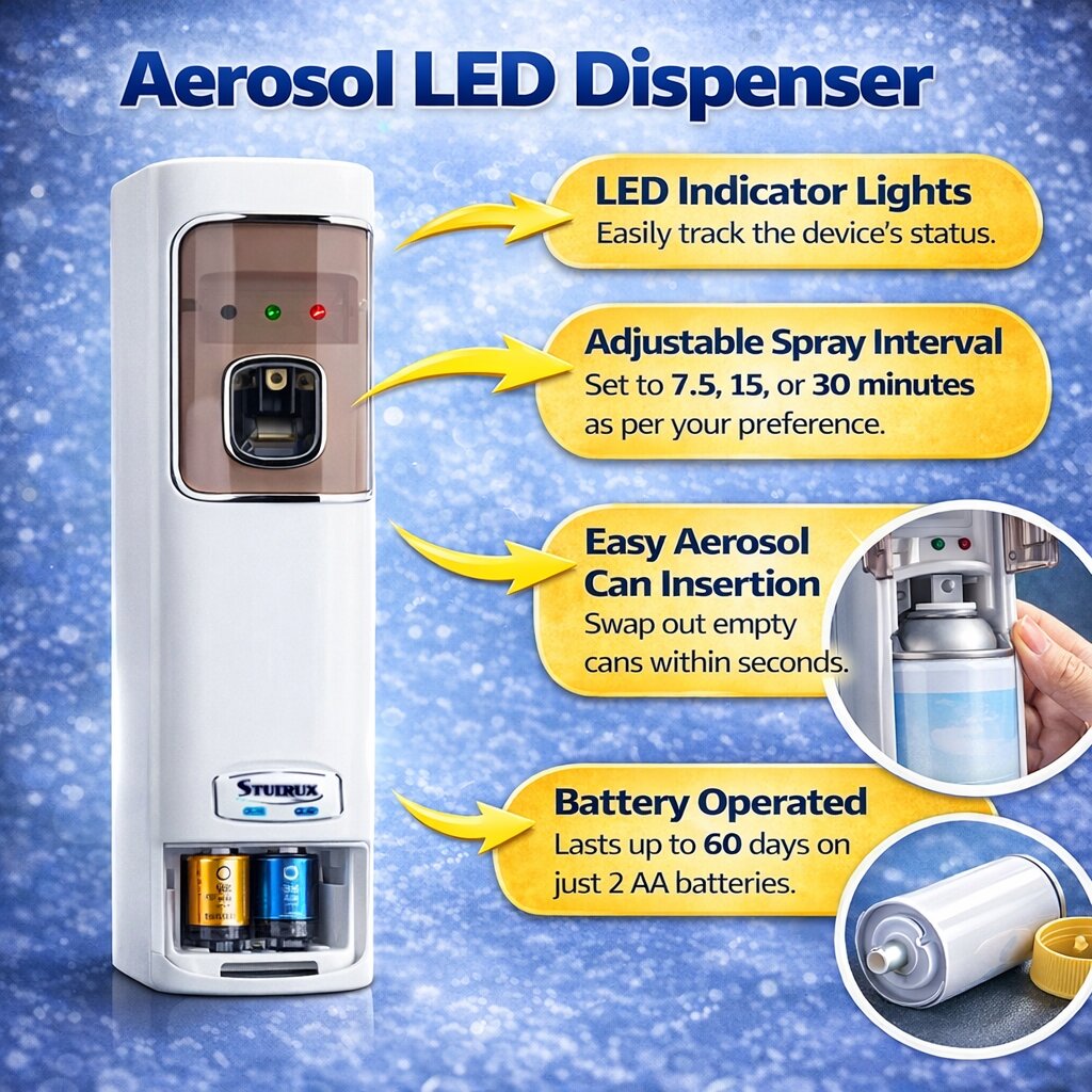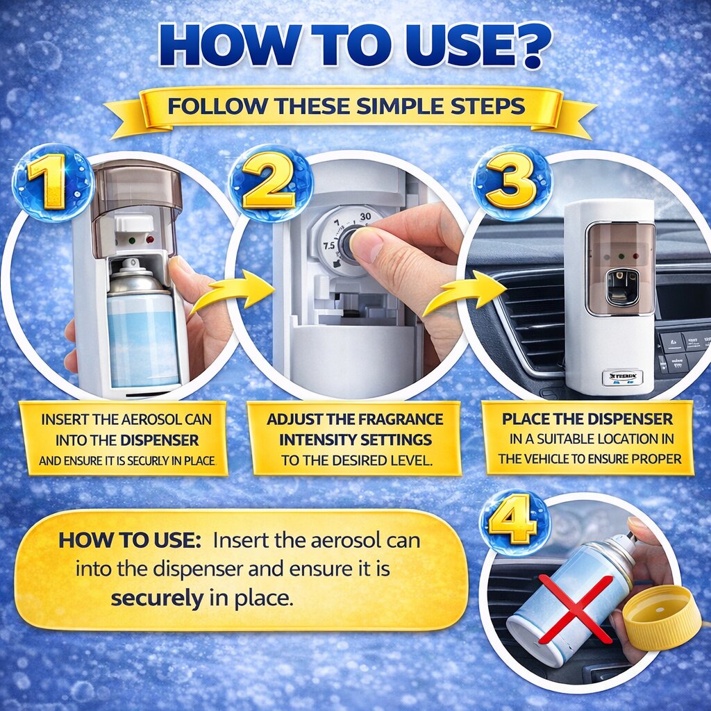 - The Aerosol Fragrance Dispenser is designed to provide a pleasant and long-lasting scent within the interior of vehicles or enclosed spaces.