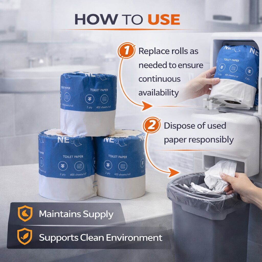 Standard commercial-quality toilet paper designed for high-use washrooms in automotive workshops, service centres, and office facilities, providing reliable hygiene and comfort