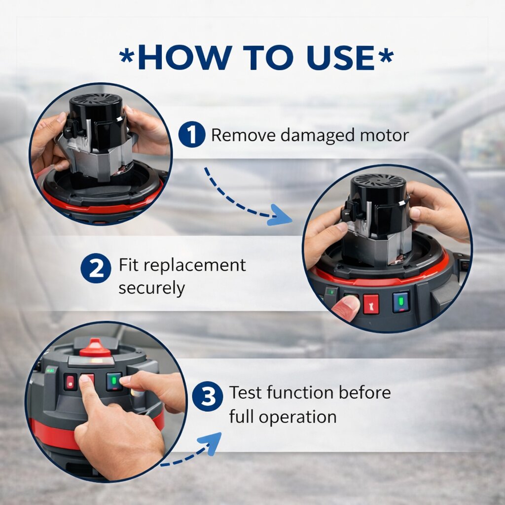 Replacement motor for commercial vacuum cleaners. Ensures restored suction performance and efficiency for detailing environments.
