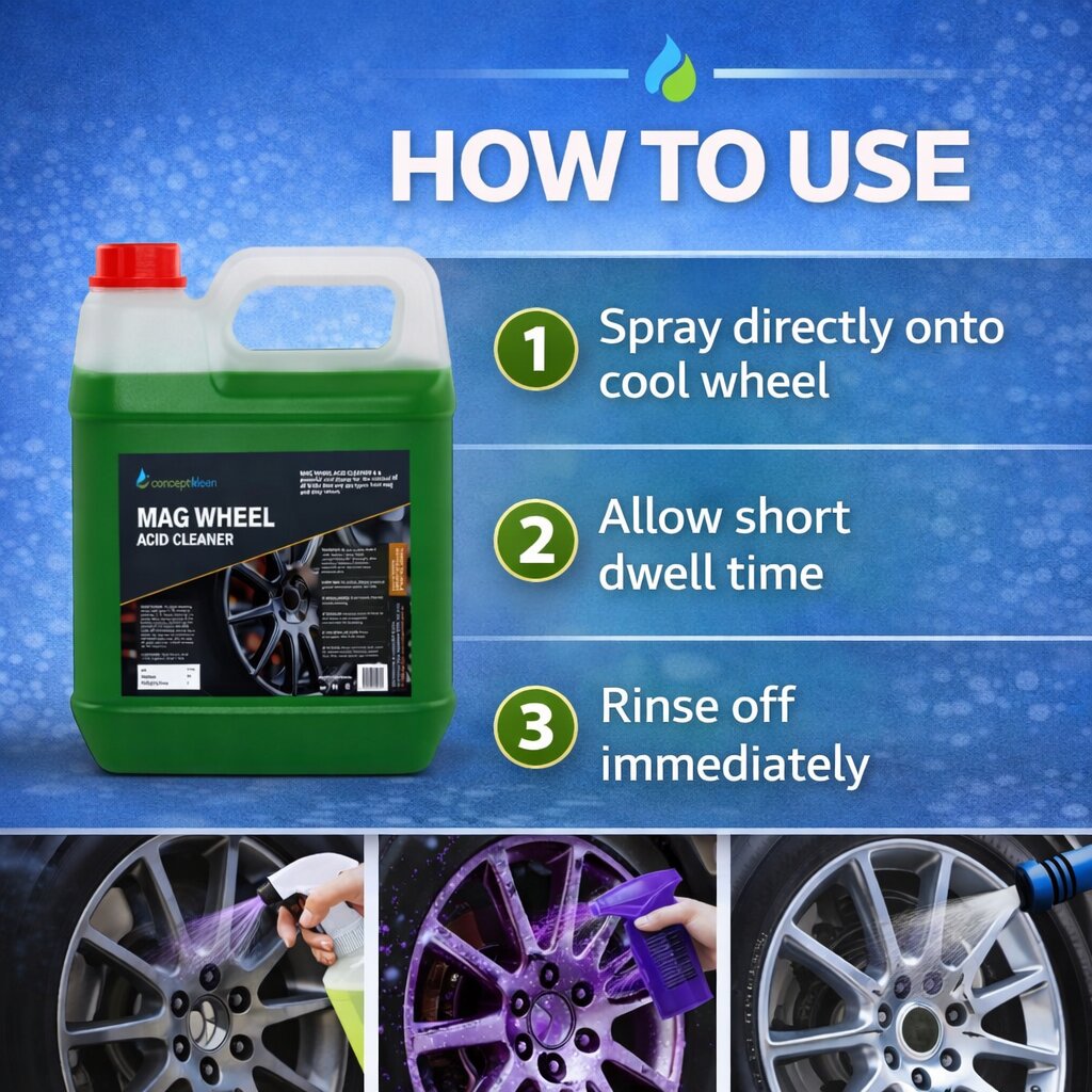 Acid-based cleaner designed to remove brake dust, rust, and heavy grime from alloy wheels. Ideal for professional wheel restoration